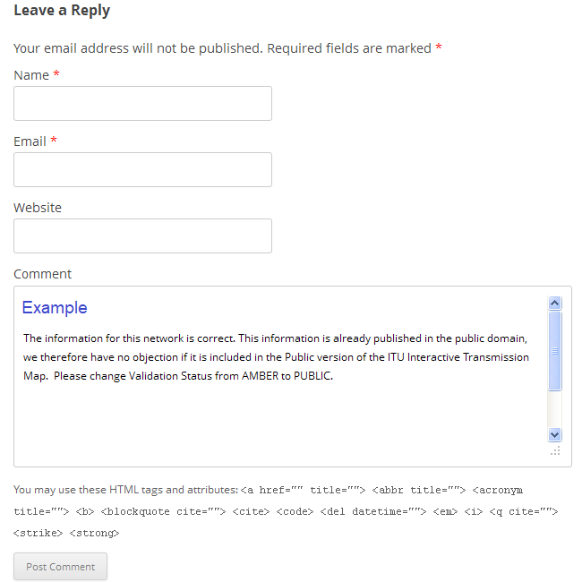 3. Moderation. Once you have finished writing your comment, click the Post Comment button. All comments will be moderated by our GIS team, who will change the validation status of this network operator as instructed by you. This change will appear in the map and its underlying database.